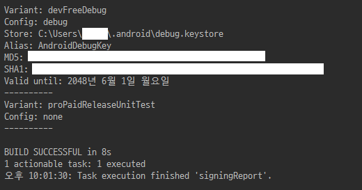 이것을 더블클릭하면 아래와 같이 Gradle Console에 SHA-1(SHA1) 키가 뜨는걸 볼 수 있습니다.