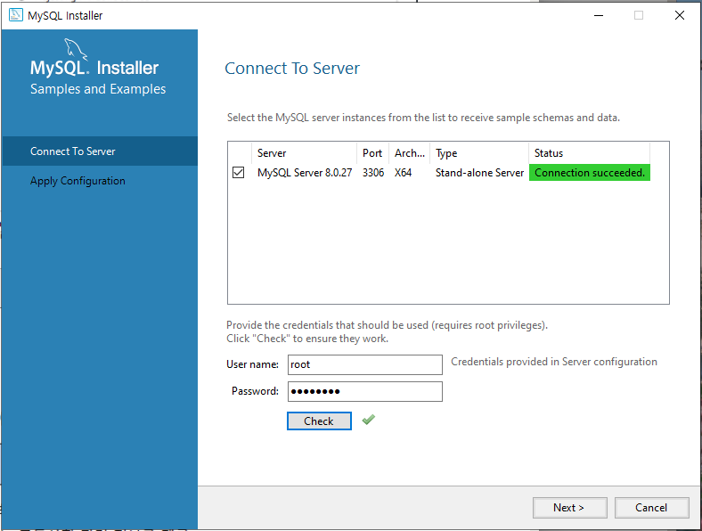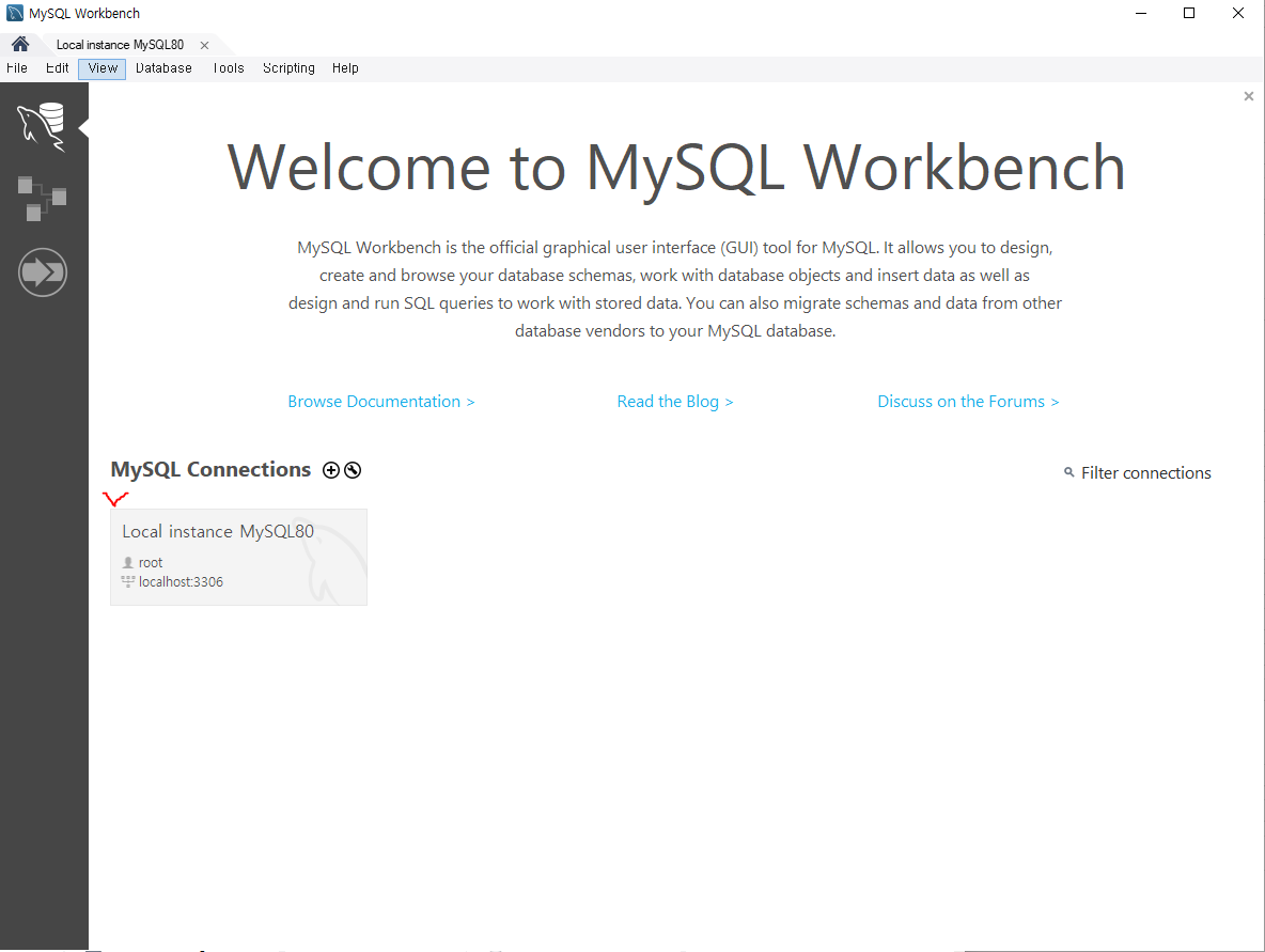 10. 설치가 끝나고 MySQL Workbench가 실행된다. Connections에 있는 것을 클릭 후 비밀번호를 입력하면 된다.