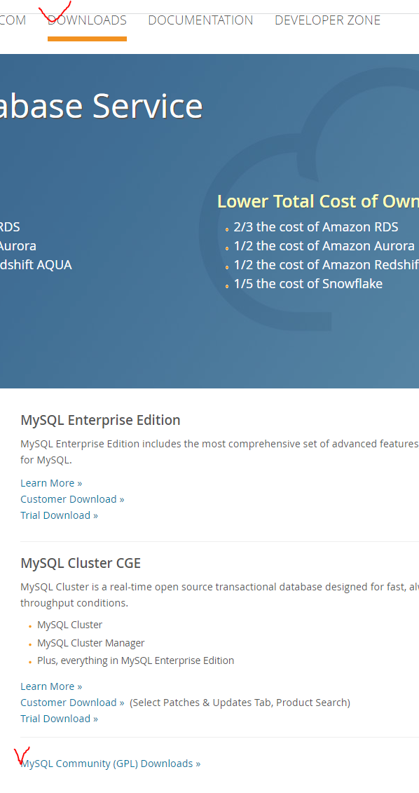 2. 사이트 메뉴에서 DOWNLOADS를 눌러 MySQL Community(GPL)Downloads를 클릭한다.