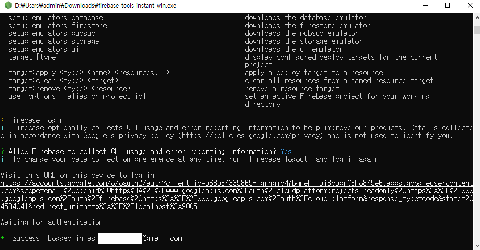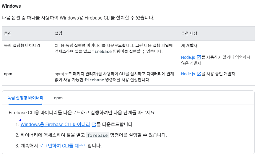 나는 1. Windows용 Firebase CLI 바이너리를 다운로드 합니다의 링크를 통해 다운로드 받았다.