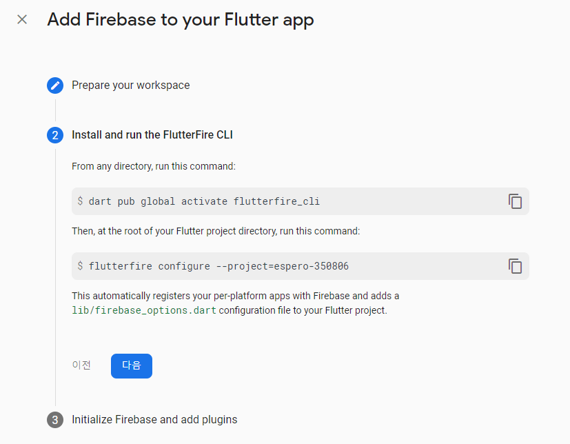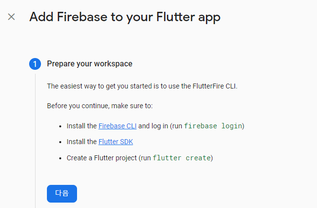 Firebase로 가서 프로젝트를 만든 후 앱을 추가해준다. 이번에 3.0이 릴리즈 되면서 Firebase에 Flutter앱을 추가할 수 있게 되었다.