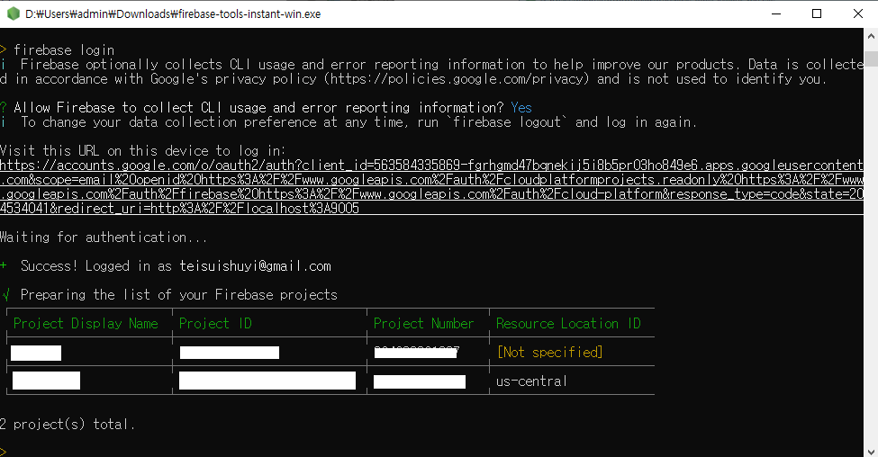 Firebase 프로젝트 목록이 제대로 나오는 걸 확인할 수 있다.