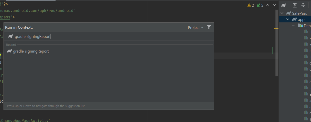 3. 창이 나오는데 검색창에 gradle signingReport 입력 후 Enter.