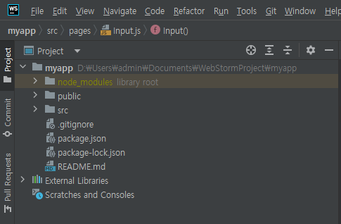 시간이 지나면 myapp라는 프로젝트(앱)이 생성이 된다. myapp 폴더를 VSCode 또는 WebStorm를 열면 된다. VSCode, WebStorm을 둘 다 사용해봤는데 나는 Android Studio에 익숙하다보니 WebStorm을 선택했다.